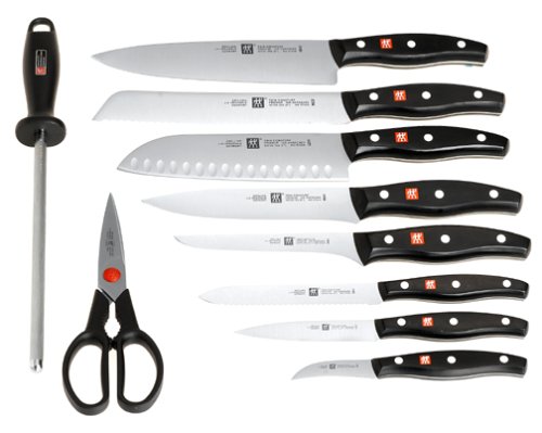 J.A. Henckels Twin Signature 11pc Block Set contains the following: 2 1/2-inch Peeler, 4-inch Parer, 5-inch Serrated Utility, 6-inch Utility, 8-inch Chef's, 7-inch Hollow Edge Santoku, 8-inch Bread, 4 1/2-inch Steak, Kitchen Shears, 9-inch Steel, Hardwood Block