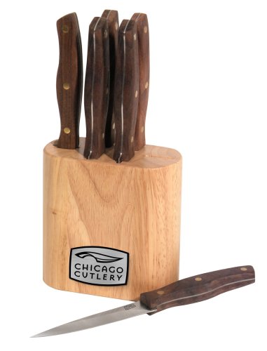 Chicago Cutlery Walnut Signture 7-Piece Steak Block Set includes 6-Each 4-1/2-Inch steak knives, 1-Each hardwood block.Chicago Cutlery Walnut Signture collection features the classic styling of beautiful wood handles. Our exclusive Taper Grind™ edge technology stays sharper longer and is easy to resharpen. High-carbon stainless steel blades resist stains and rust for lasting beauty. Triple compression brass rivets hold the handles securely to blade for safety and stability.