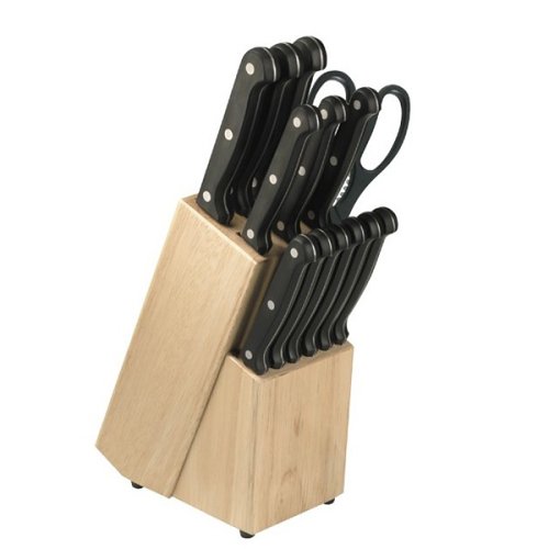 Ginsu International Traditions 14-Piece Bakelite Knife Block Set stocks a kitchen with most cutlery needs, and packs all knives in a contemporary black hardwood storage block. The set includes: an 8-inch chef's knife, an 8-inch slicer, an 8-inch bread knife, a 5-inch boning knife, a 4-1/2-inch utility knife, a 3-1/2-inch paring knife, and six 4-1/2-inch steak knives, plus a pair of shears.