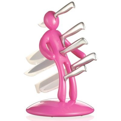 THE EX, A radical alternative to the typical block o' wood, will revolutionize the way you store your knives! No knife holder has taken a greater stab at the theatrical than this specially designed Ex knife holder. Et tu, Brute? This 5pc knife holder is unlike any cutlery set you have ever seen! This whimsical, artistic kitchen accessory holds 5 high quality stainless steel kitchen knives (included) in a rather unorthodox fashion - STORE YOUR KNIVES IN AN ANONYMOUS EFFIGY DEDICATED TO WHOMEVER YOU PLEASE! Take out your frustrations as you store your knives! Makes a perfect gift and a guaranteed conversation piece! Plastic casings house every knife to prevent blade exposure.